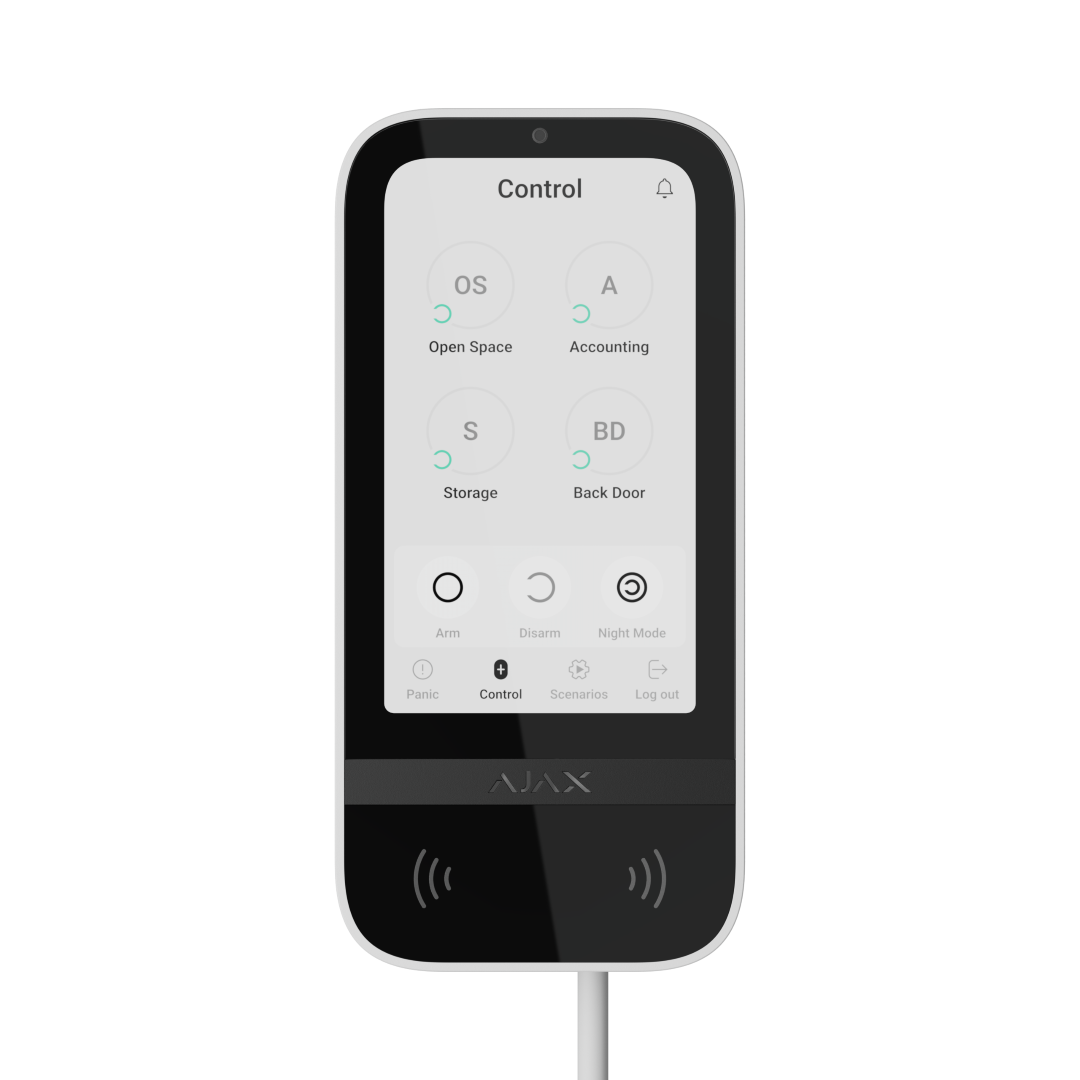 Das 5-Zoll-Display aktiviert sich bei Annäherung und bietet eine Benutzeroberfläche wie die Ajax App. Der integrierte Summer informiert über Alarme, Scharf-/Unscharfschaltung und Systemereignisse. Bei drei falschen Eingaben binnen einer Minute aktiviert sich der Codeblock — die Hub ignoriert weitere Eingaben für eine voreingestellte Zeit.