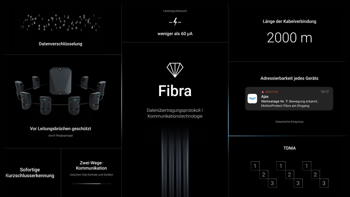 Das Alarmsystem Fibra von Ajax Systems vereint die Zuverlässigkeit von Kabeln mit der Freiheit der Funkverbindung - eine kabelgebundene Technologie der digitalen Generation. Im Kontrast zur Technologie der 80er Jahre, die immer noch in der Sicherheitsbranche anzutreffen ist, haben unsere Ingenieure Fibra entwickelt und die Innovationen von Ajax Systems hierdurch ein neues Niveau erreicht. Fibra bedeutet Kompatibilität mit allen Gerätetypen, moderner Sabotageschutz, 60 Stunden Betrieb eines Systems mit Reservebatterie, Fotobestätigung von Alarmen, Konnektivität über eine Entfernung bis zu 2000 Meter sowie mühelose Installation und Fernkonfiguration über eine App.